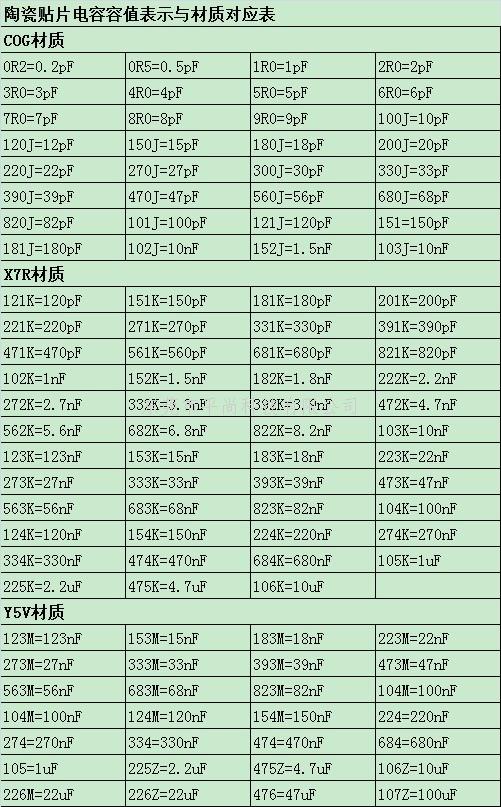 偏差:B=±0.1pF、C=±0.25pF、D=±0.5pF、F=±1%、G=±2%、J=±5%、K=±10%、M=±20%、Z=-20%+80%。