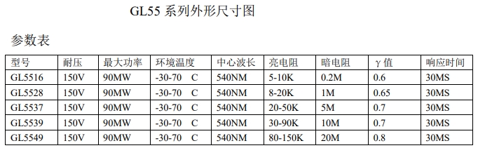 下面是光敏电阻55系列和56系列参数大全