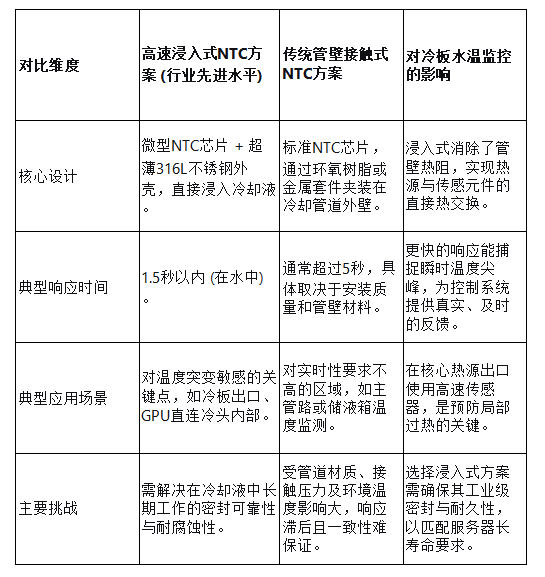 响应速度,通常指热敏电阻对环境温度阶跃变化作出63.2%响应所需的时间(即热时间常数)。在冷板进出口的流道中,冷却液的温度变化速率可能非常快。若传感器响应滞后,监控系统读取的将是一个“过去”的温度值。根据行业数据,传统安装不当或封装粗笨的传感器响应时间可能超过3秒,而先进方案已能将此指标缩短至1.5秒。这1.5秒的差距,在应对AI算力突发负载时,可能导致冷却系统动作延迟,使得芯片结温在调控介入前已触及安全红线。