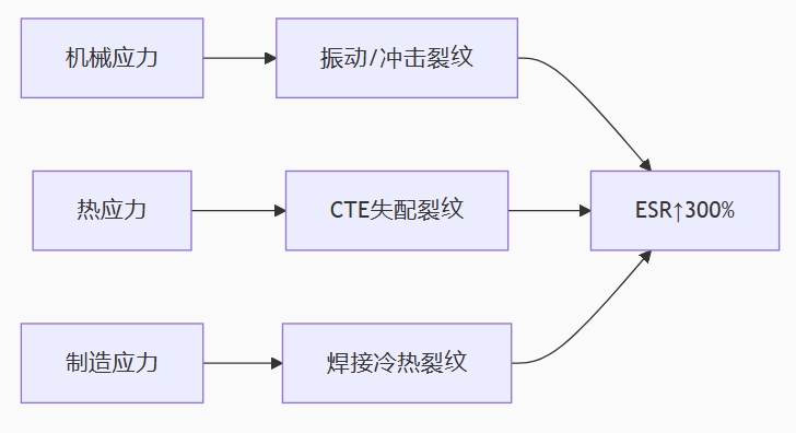 某汽车焊接产线机械臂曾因控制板电容微裂纹导致信号滤波失效,引发焊枪定位偏差0.3mm,单日损失超200万元。显微分析显示:在经历80万次运动循环后,电容端电极与介质层间产生12μm裂纹,等效串联电阻(ESR)从80mΩ飙升至1.2Ω。