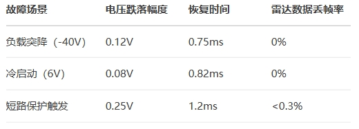 尤其在-40℃低温冷启动场景,固态电容的低温特性使传统方案中3V的电压跌落被抑制到0.15V以内,保障雷达点云输出零中断。