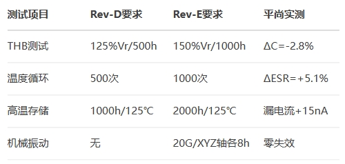 Rev-E标准对车载电容提出三重炼狱考验:- 湿热偏压测试:额定电压150%下持续1000小时(旧标125%/500h)