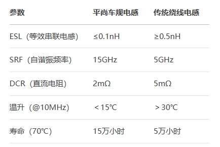 77GHz毫米波雷达的电源模块需在GHz级频段(24GHz~80GHz)维持超低噪声,但传统贴片电感因电极结构与磁芯损耗问题,易产生寄生电感(ESL>0.5nH)和集肤效应,导致高频噪声耦合与自发热。例如,某车企的雷达模块曾因电感ESL过高,引发虚假目标检测率从1%飙升至8%。此外,车载环境下的极端温度(-40℃~150℃)与机械振动(50G加速度)可能加剧电感参数漂移,影响雷达系统的长期稳定性。