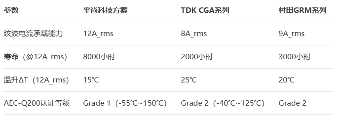 竞品对比与实测验证在105℃/12V工况下,平尚科技方案性能显著优于行业标杆TDK与村田: