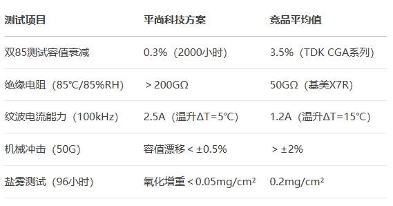 平尚科技对25V/100μF车规电容进行全维度测试,关键指标显著优于行业水平: